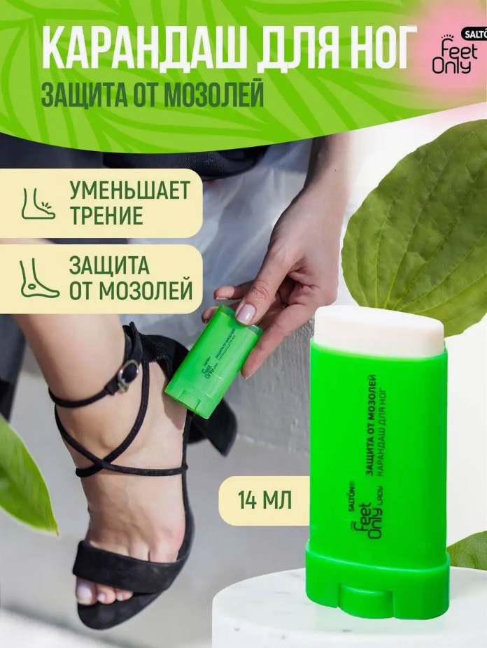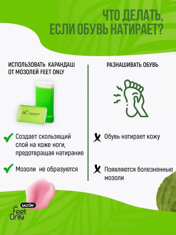 • Используйте специальные средства, чтобы защитить проблемные участки стопы от трения и повреждений. Например, карандаш для ног “Защита от мозолей 3 в 1” от Salton Feet Only. Он создает невидимый защитный барьер, который предотвращает появление мозолей при ношении обуви, мгновенно уменьшает трение о внутренние части обуви, успокаивает и смягчает кожу стоп и облегчает разноску новой пары обуви. Кроме того, средство не оставляет следов на одежде и обуви.